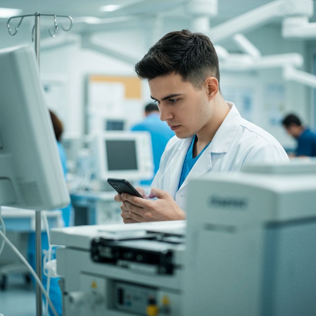 Tech uses WhatsApp to engage Leera AI while working on equipment. No app download. Works on any phone, anywhere in the hospital.